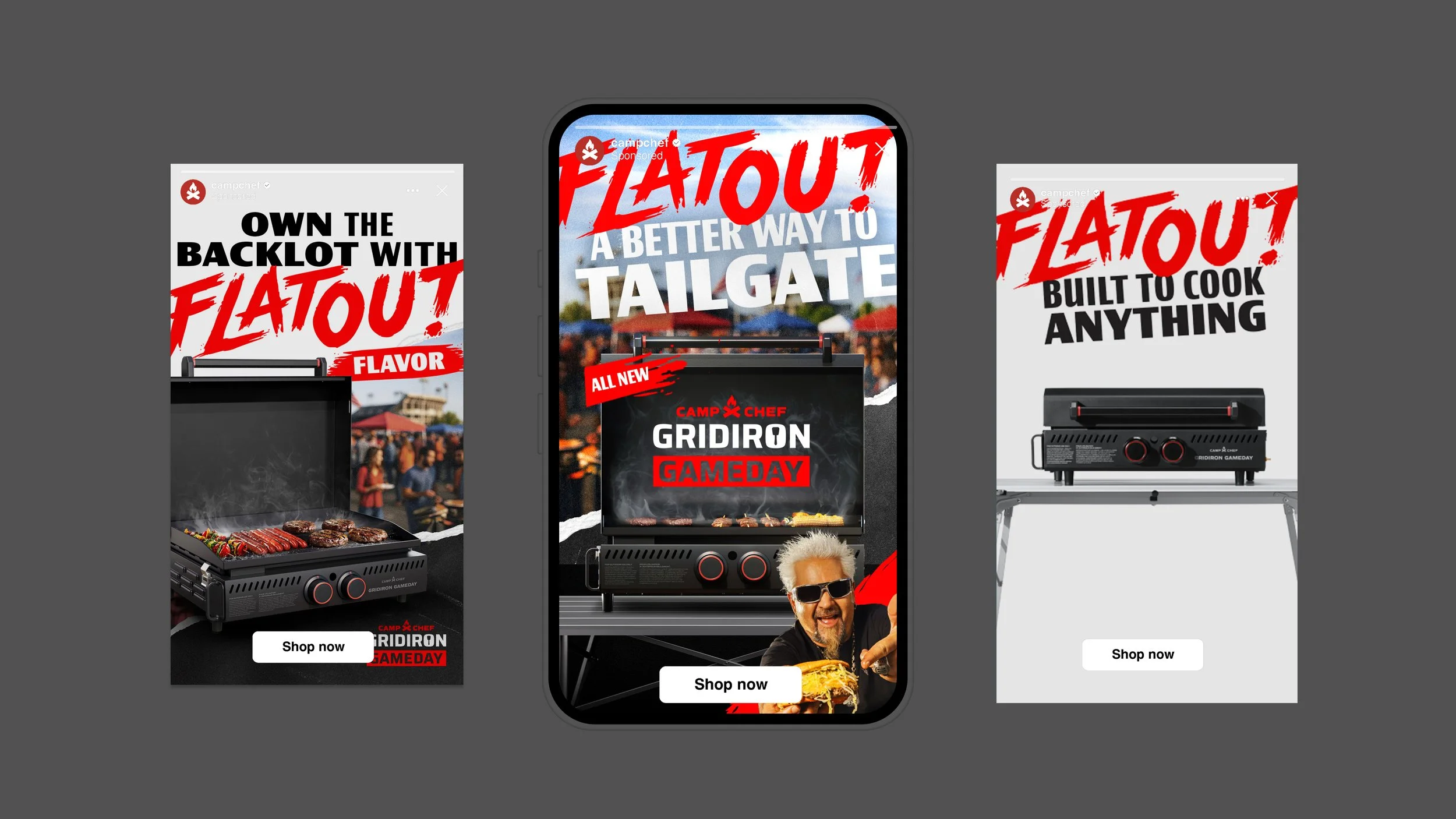 Partnering with Pilot Agency, I helped drive the FLATOUT! multi-channel campaign launch with Guy Fieri and Camp Chef, creating a suite of digital assets across Amazon, email, paid and organic social, and the Camp Chef website for cohesive cross-channel creative.